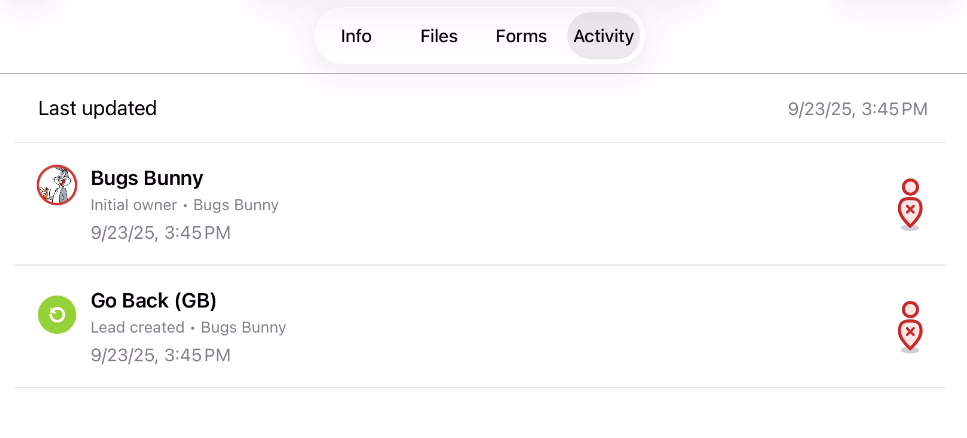 - When you create a lead it will mark the date and time that the lead was created in the 'Activity' tab. It will also mark the date and time of who created the lead and your proximity to that lead when it was created/updated.