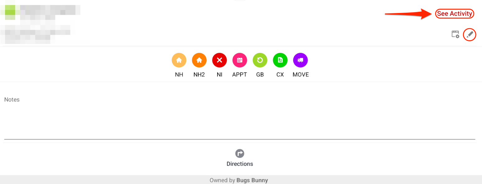 - The 'Activity' section is found within the lead. Click on a dispositioned lead within an account. Then click on the 'Pencil' icon in the top right-hand corner of the lead menu screen or the "See Activity" button.