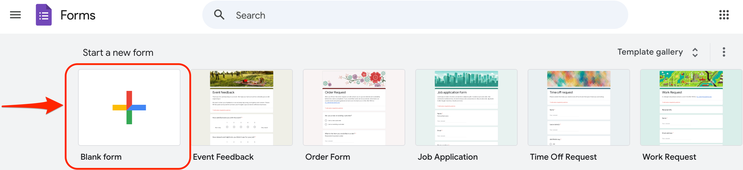 - Once on the Google Forms dashboard, click "Blank".