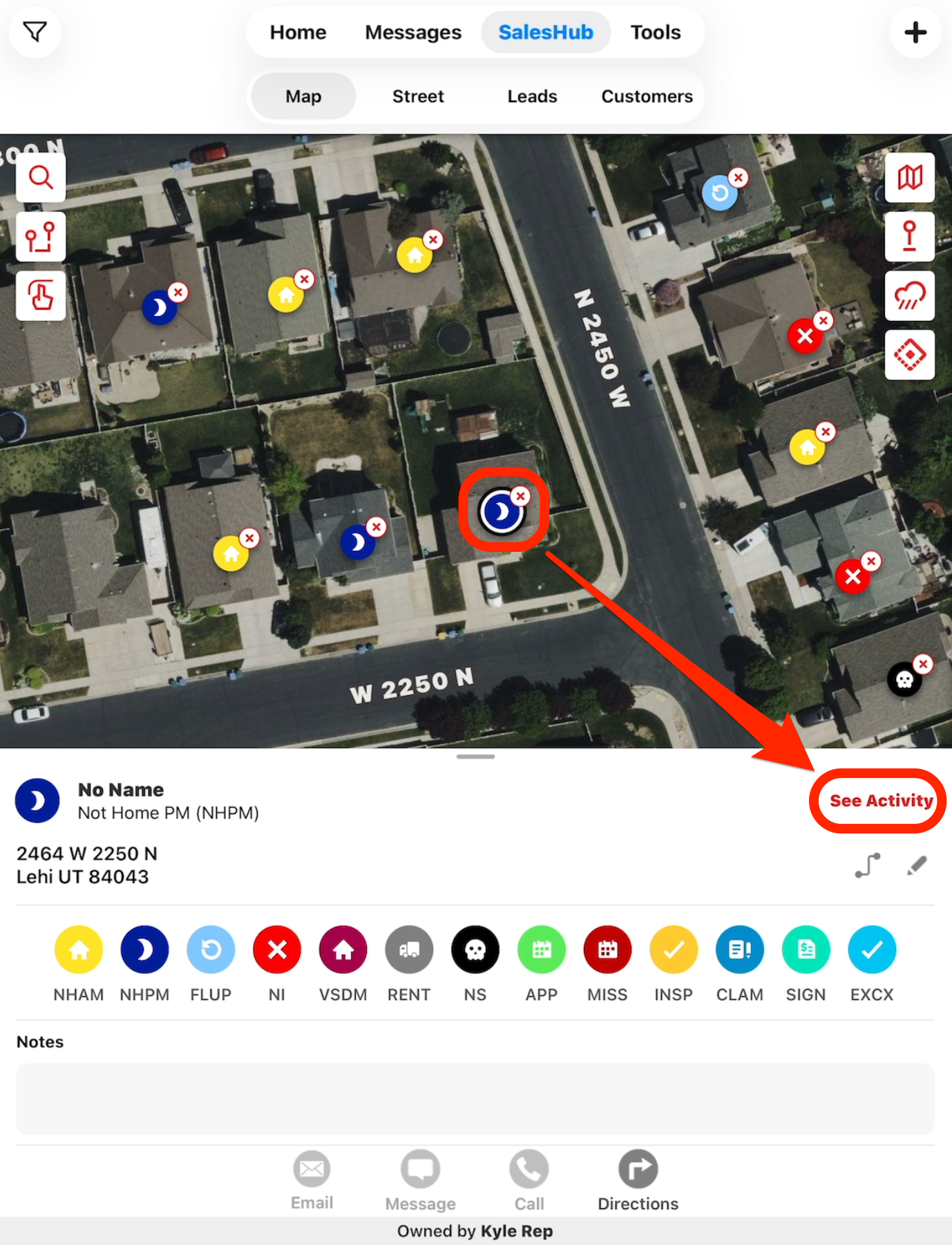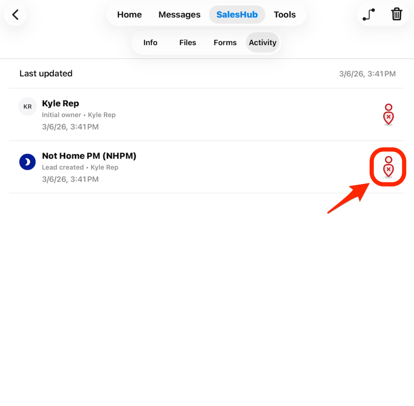 - Red X: the user was farther than 100 meters away from the lead when it was last updated.