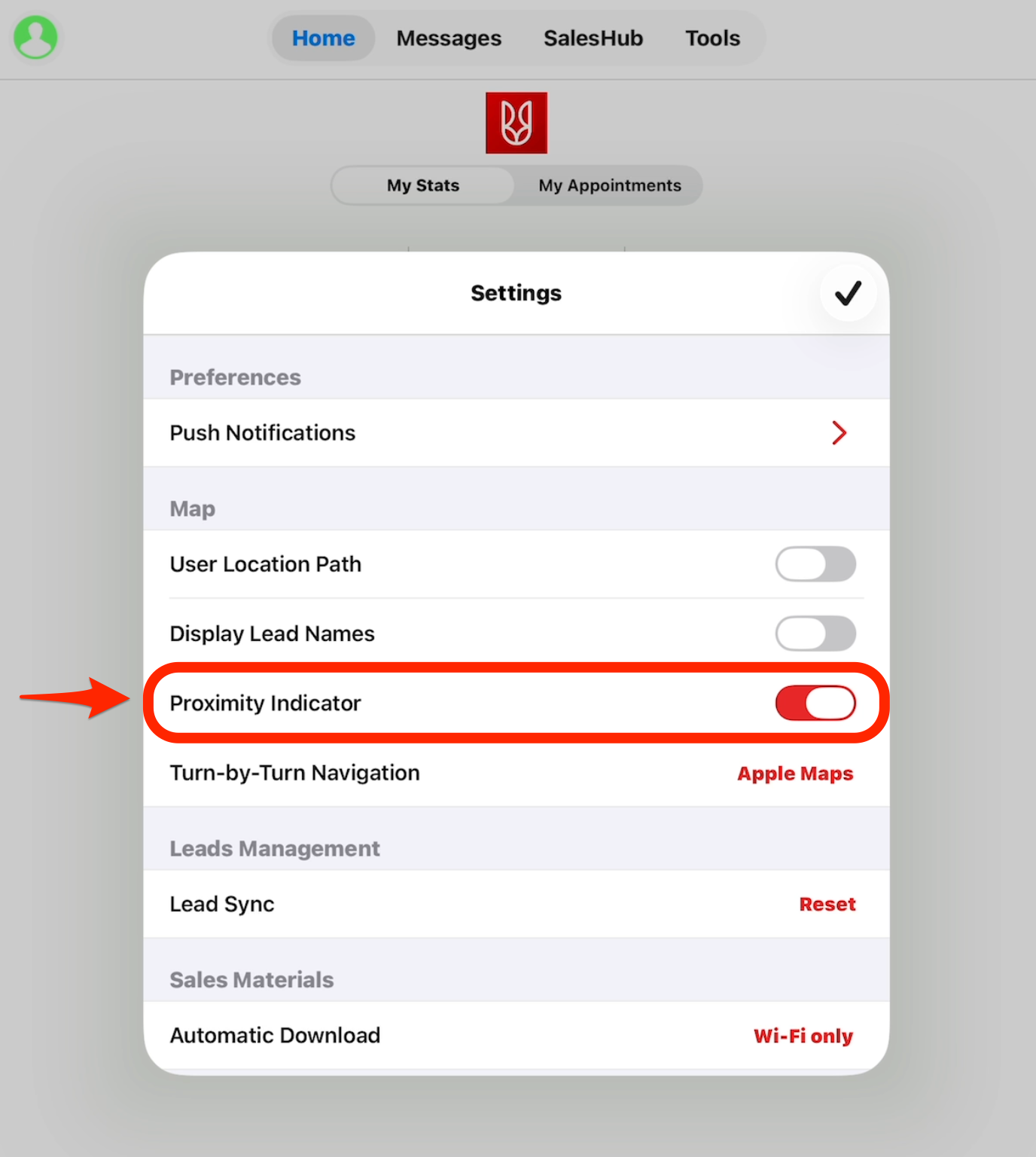- Enabling this setting will display the proximity indicator on leads in the SalesHub Map on your device.