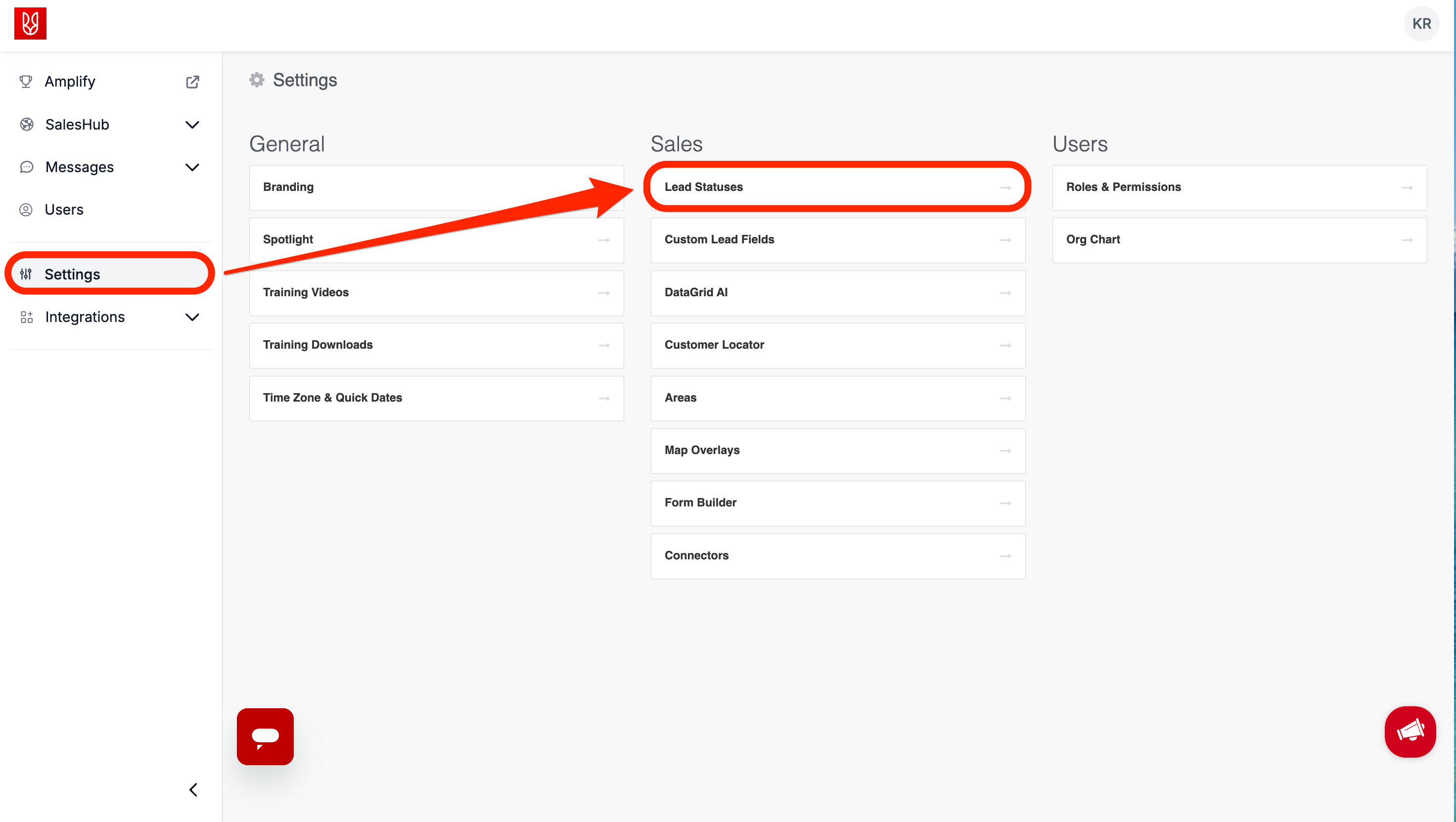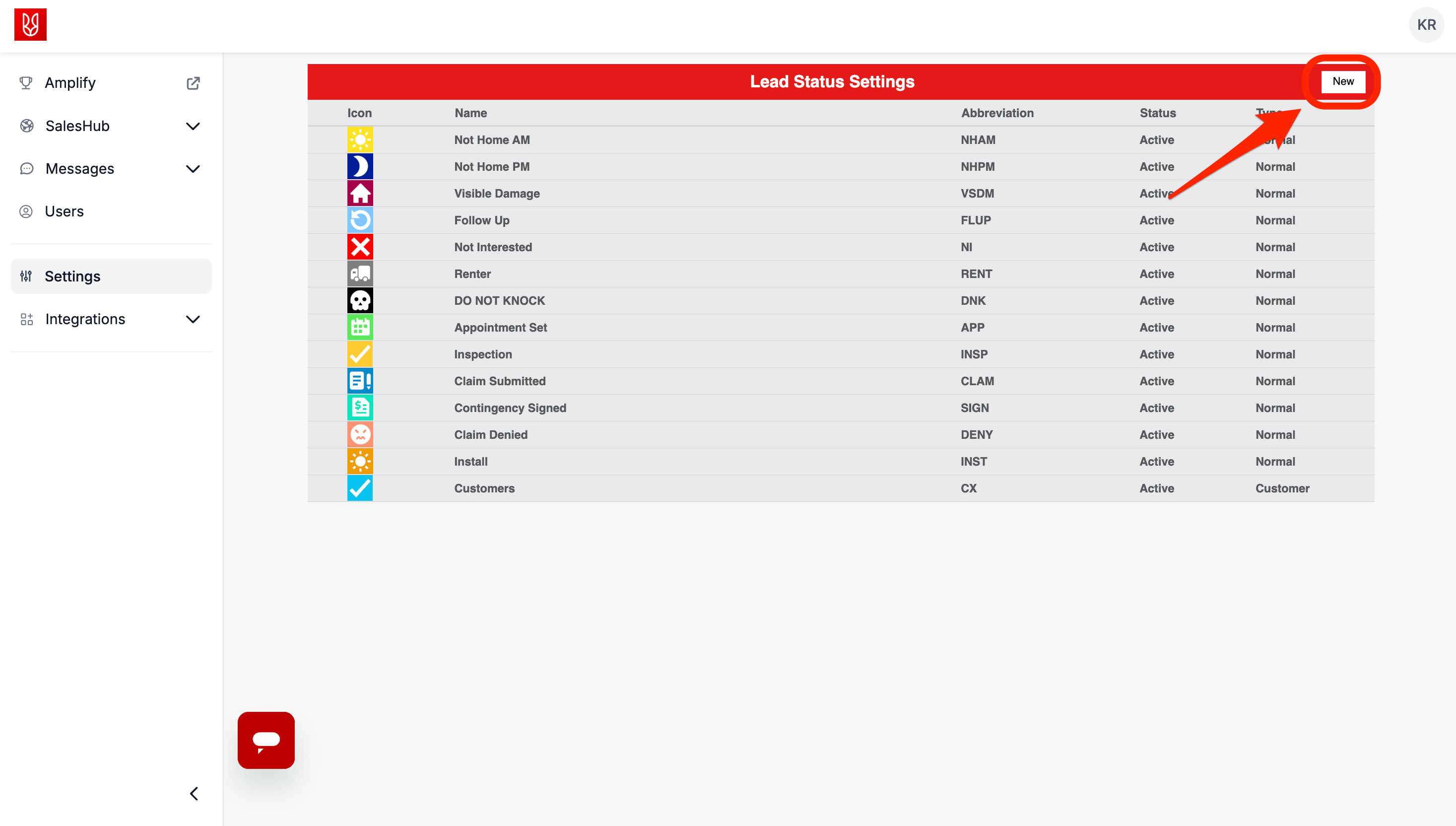 - From the SalesRabbit Web App, navigate to "Settings" -> click "Lead Statuses".