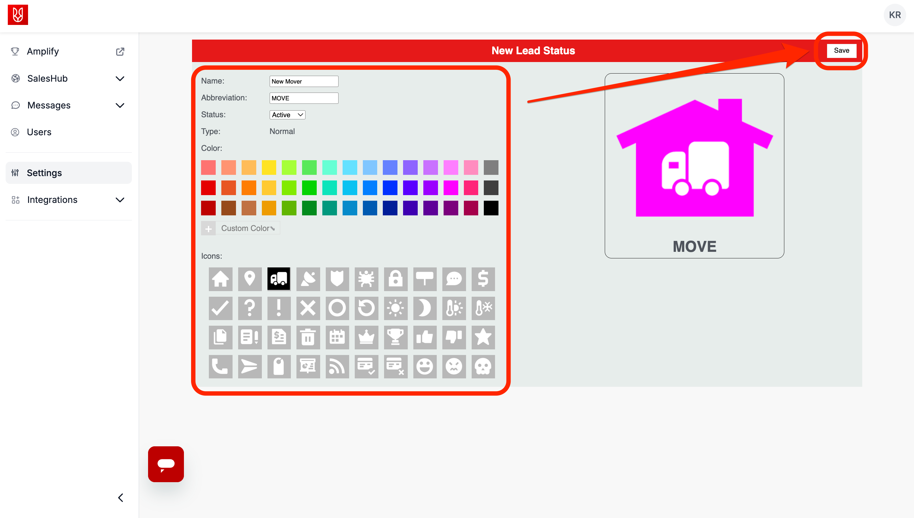 - Note: the screenshot below is simply an example. Your status can be whatever name/abbreviation/color/icon you see fit to disposition new mover leads with.