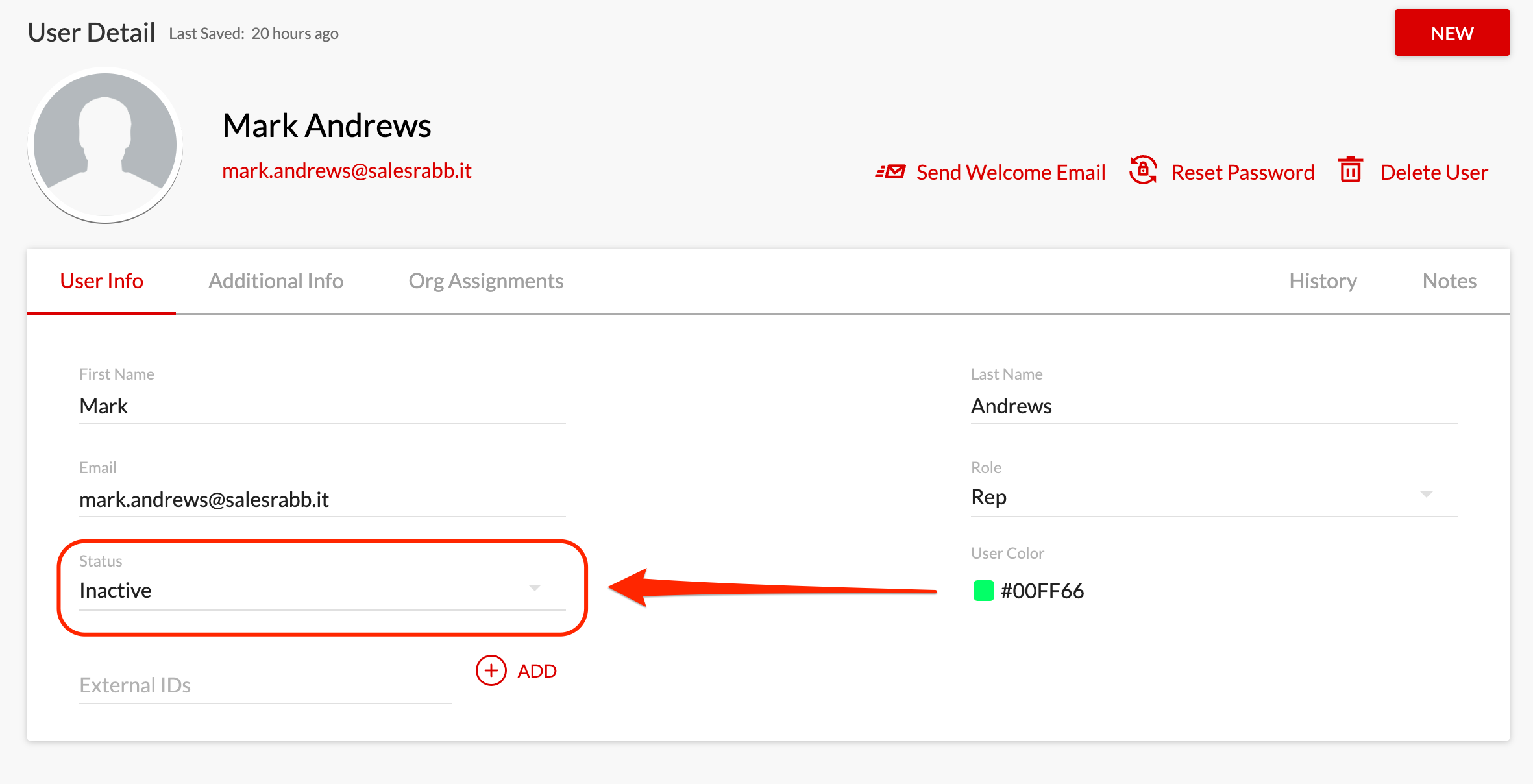 • If you click on the Inactive User it will take you to the User Detail Page where you will need to activate the user from the Status drop down menu.
