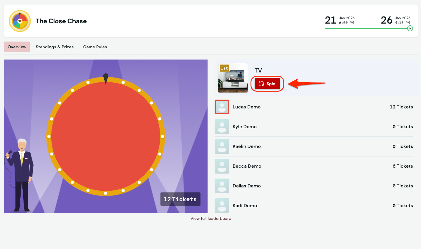 - Access the Competitions section from the left side menu and select your competition. Use the Spin button in the wheel's center to play the event on the screens.