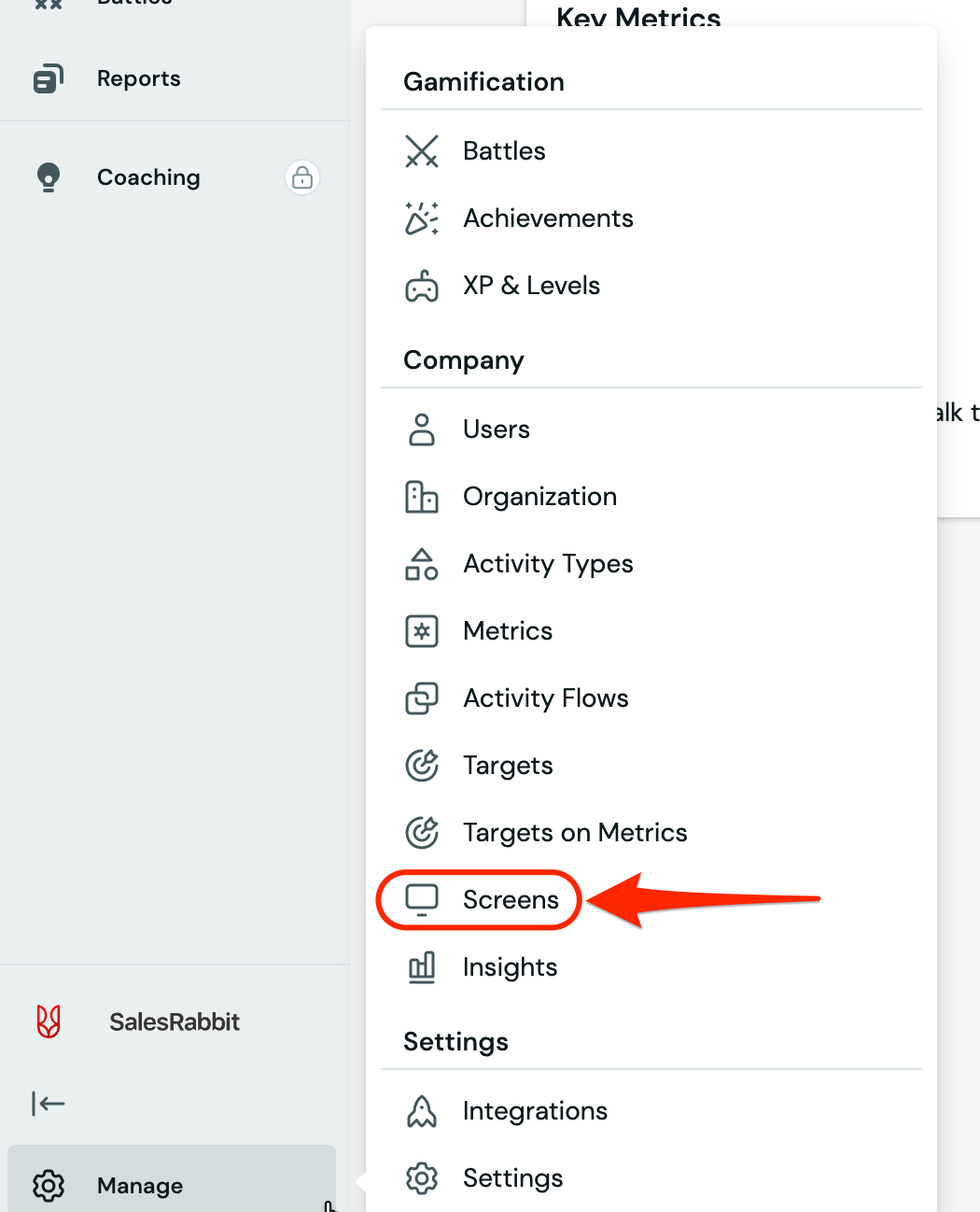 The first step is to click on Manage at the bottom left corner of SalesScreen. A menu will pop up, where you can proceed to click on Screens under the Company headline.