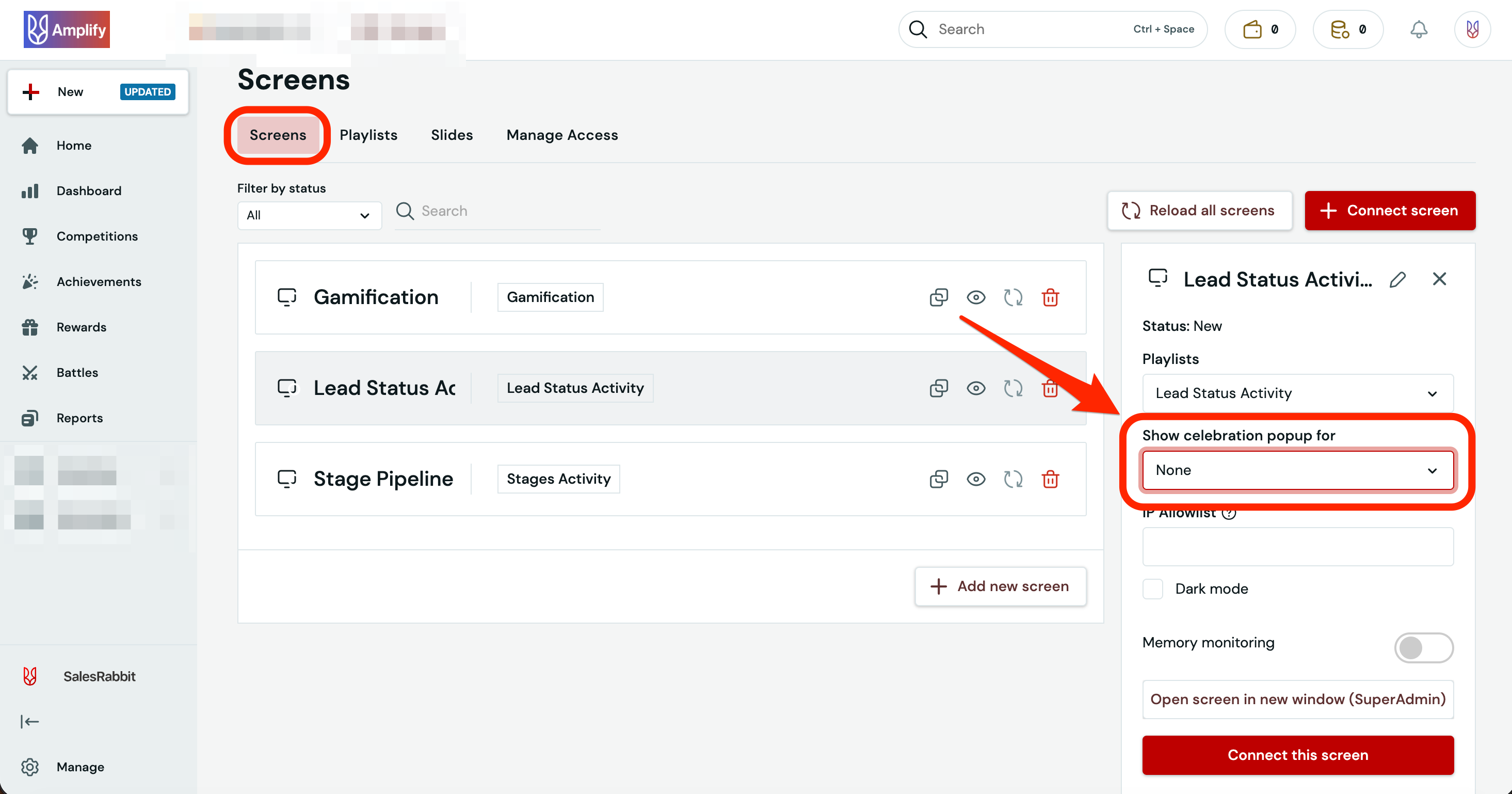 This guide is designed for Company Admins and Screen Admins to configure screen celebrations in Amplify. It walks through the steps to access the screens management page, navigate to a specific screen’s settings, and adjust celebration settings for different teams.