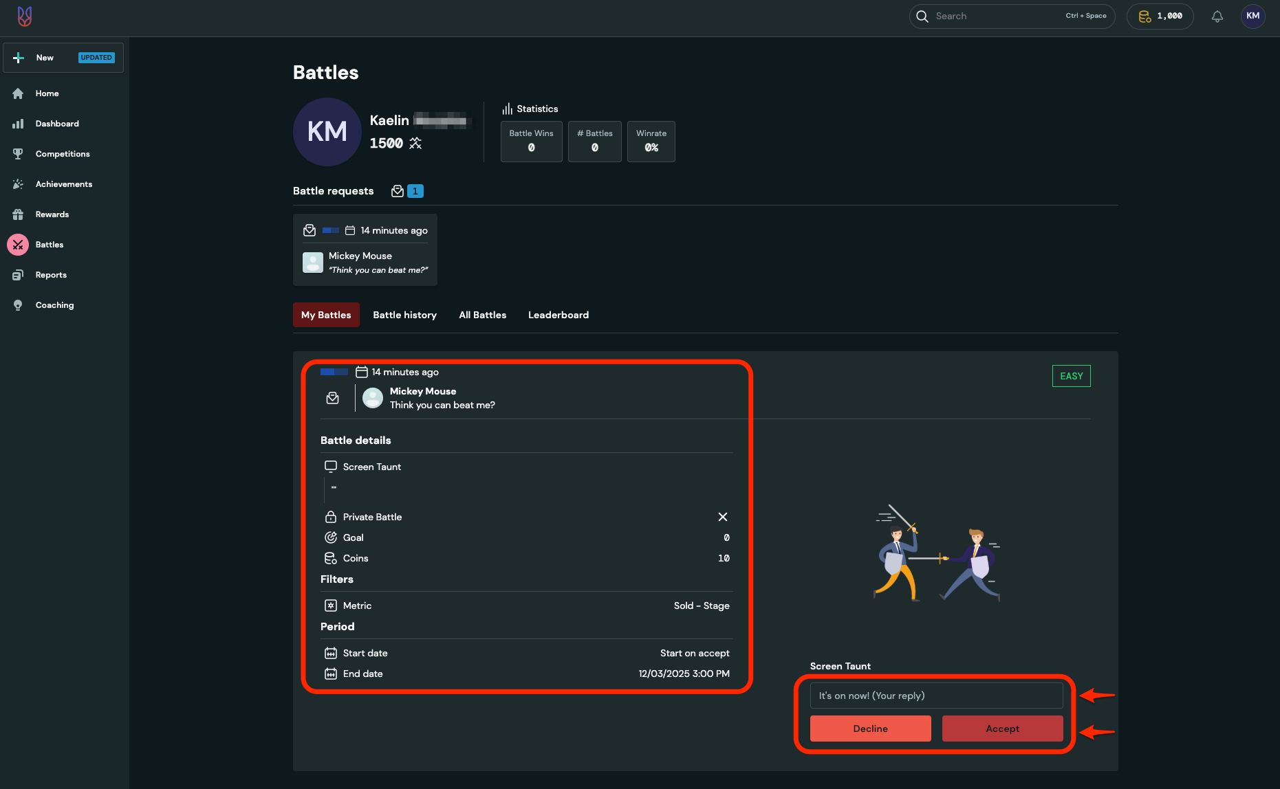 - You will now be presented with the information about the battle. You can also send a message before you start the battle. From here, you can choose to accept or decline the battle.
