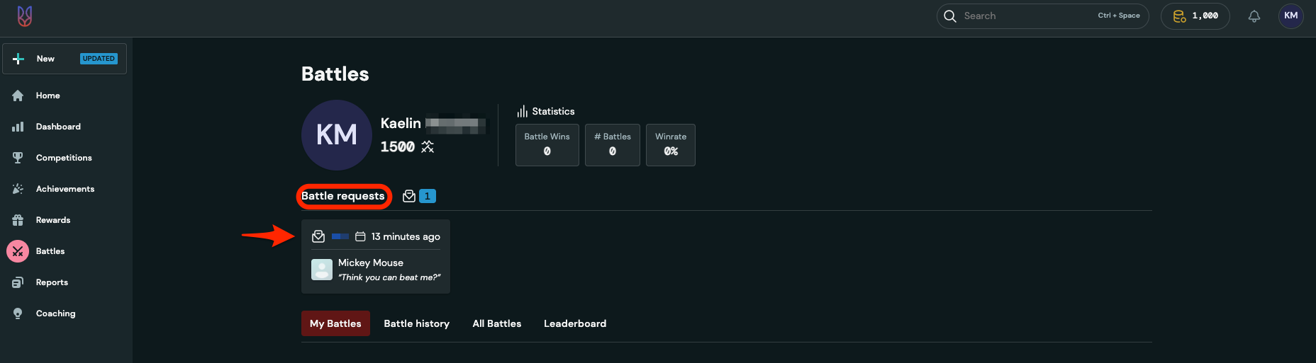 - You will be presented with the Battles page. If you have been invited to a battle, under "Battle requests" you will see a notification that you can click on.