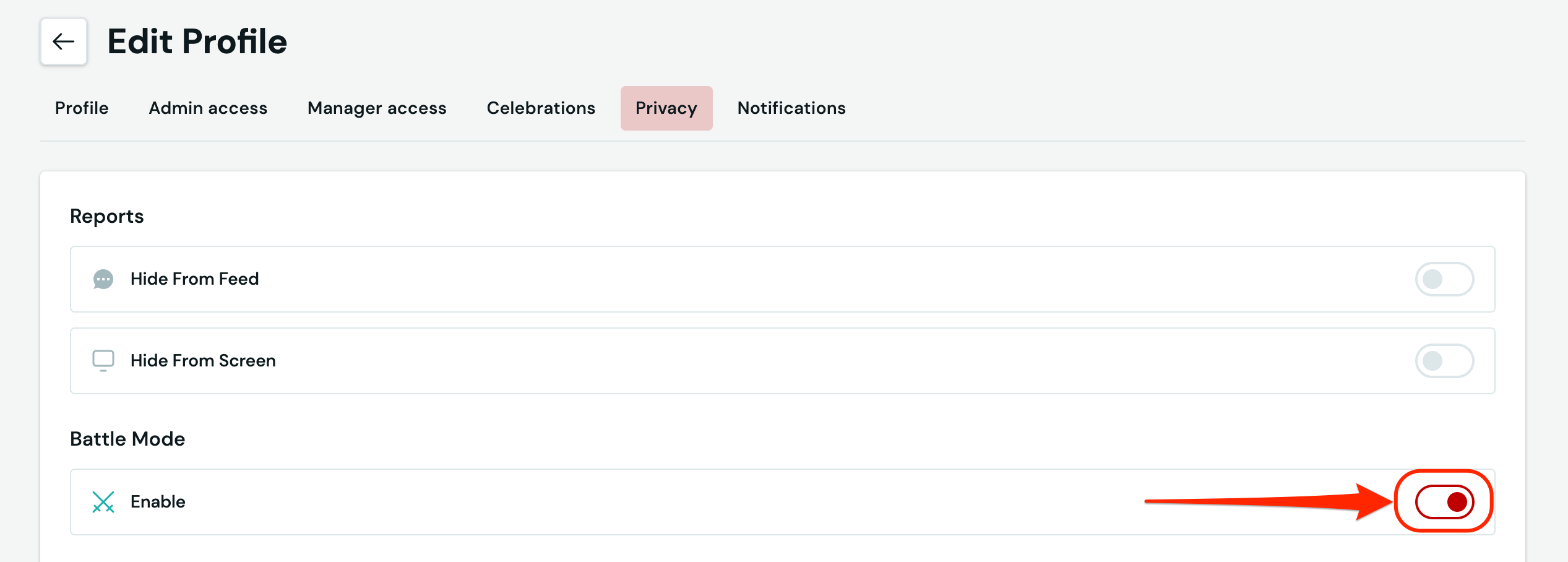 - Next, click on Privacy: Switch ON or OFF the Battle mode enabled slider.
